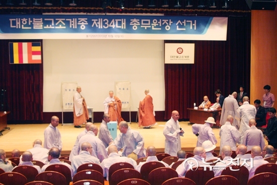 ▲ 신임 총무원장 선거가 시작됐다. 선거인단들이 투표하고 있다. ⓒ천지일보(뉴스천지) [천지일보=박준성 기자] 한국불교 최대 종파인 대한불교조계종 제34대 총무원장 선거가 10일 오후 1시 한국불교역사문화기념관 전통문화공연장에서 시작됐다.