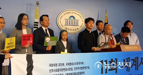 [천지일보=명승일 기자] 정의화 새누리당 의원, 유인태 민주당 의원, 국제엠네스티한국지부와 시민사회단체 대표 등이 10일 국회 정론관에서 사형제 폐지를 촉구하는 기자회견을 열고 있다.