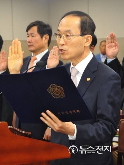 [천지일보=김예슬 기자] 15일 환경노동위원회의 환경부에 대한 국정감사에서 윤성규 환경부 장관이 선서를 하고 있다.