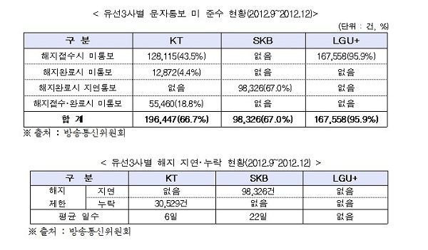 국감 시 공개한 자료에 따르면 유선 3사의 이용약관에는 해지 접수‧완료시 이용자에게 각각 1회씩 총 2회 문자로 통보하고 이용자의 해지 희망 일에 해지하도록 규정하고 있다. 그럼에도 유선 3사는 해지 과정을 문자로 통보하지 않거나 고의로 해지처리를 지연‧누락시킴으로써 이용약관을 위반한 것으로 나타났다.