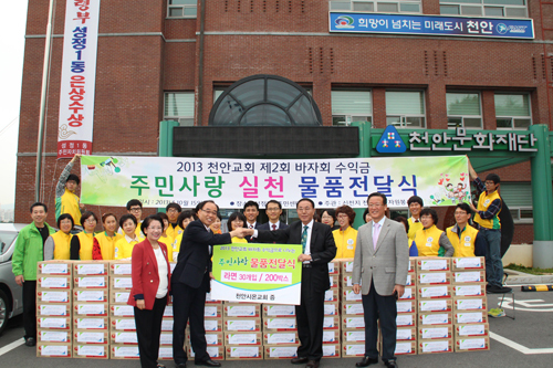 한편 천안교회는 2012년에도 ‘제1회 화합과 축제, 이웃사랑 주민사랑 열린 바자회’ ‘사랑의 김장 나누기’ 등을 실시해 쌀 200포와 김장 김치 250포기를 성정1동 주민들에게 전달한 바 있다.