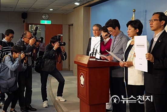 [천지일보=명승일 기자] 민주당 보건복지위원회 소속 의원들이 16일 국회에서 보건복지부가 국정감사를 앞두고 새누리당 의원들에게 보낸 기초연금 야당 의원 발언 대응 배포 자료를 공개하고 있다.