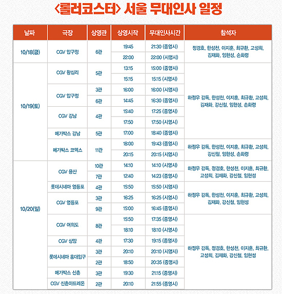 올 하반기 최고의 코미디를 보장하는 ‘롤러코스터’의 하정우 감독과 정경호, 한성천, 이지훈, 최규환, 고성희, 김재화, 강신철, 임현성, 손화령이 18일, 19일, 20일 3일간 서울 지역에서 무대 인사를 통해 관객들을 만날 예정이다.