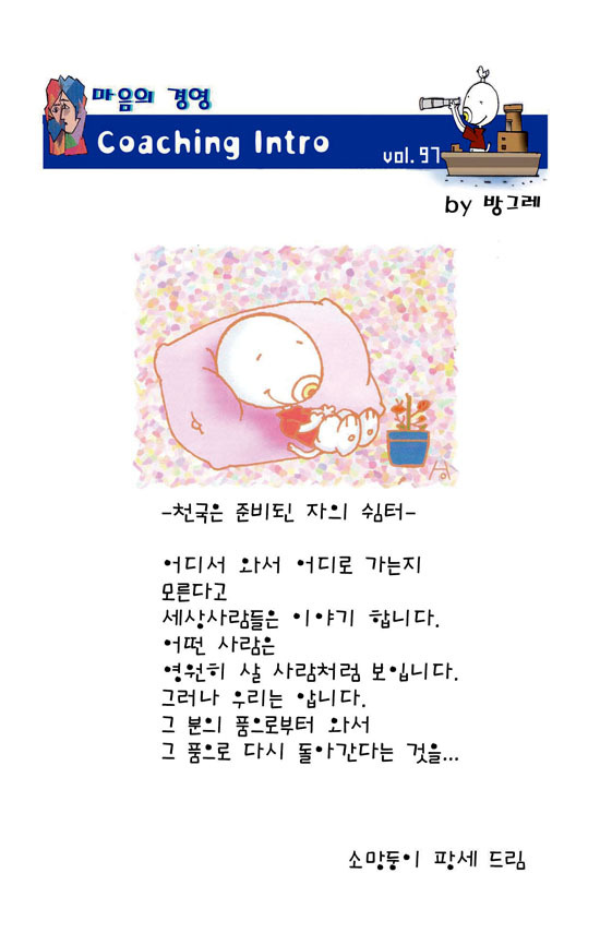 이전 기사보기 다음 기사보기 [마음의 경영] 천국은 준비된 자의 쉼터 바로가기 복사하기 본문 글씨 줄이기 본문 글씨 키우기 스크롤 이동 상태바 [마음의 경영] 천국은 준비된 자의 쉼터 오피니언 입력 2013.10.17 17:35 수정 2013.10.17 17:41 기자명 천지일보 newscj@newscj.com 페이스북(으)로 기사보내기 트위터(으)로 기사보내기 카카오톡(으)로 기사보내기 텔레그램(으)로 기사보내기 URL복사(으)로 기사보내기 바로가기 기사스크랩하기 다른 공유 찾기 본문 글씨 줄이기 가 본문 글씨 키우기 이 기사를 공유합니다 페이스북(으)로 기사보내기 트위터(으)로 기사보내기 카카오톡(으)로 기사보내기 텔레그램(으)로 기사보내기 URL복사(으)로 기사보내기 닫기 VOL. 97 천지일보는 24시간 여러분의 제보를 기다립니다. 천지일보 카톡 1644-7533 newscj@newscj.com 제보하기 천지일보 newscj@newscj.com 다른 기사 보기 관련기사 [마음의 경영] 쓰레기에 새 생명을 [마음의 경영] 네가 곤경에 처하거든 [마음의 경영] 당신을 사랑하는건 [마음의 경영] 어릴 적 나는 부모님의 다툼으로 [마음의 경영] 담장은 [사설] 대기업 고시 이대로 두고만 볼 것인가 [최상현의 세상보기] 장한가(長恨歌)-황제의 사랑 [에듀윌칼럼] 팀워크의 중요성 [한병권의 느낌표!] 스팸 공해에 대처하는 법 [마음의 경영] 삶이란? [마음의 경영] 이미 저질러진 일은 [마음의 경영] 외모와 마음중에서 [마음의 경영] 산을 내려오기 위해 [마음의 경영] 난 마음을 먹는 것만으로도 저작권자 © 천지일보 무단전재 및 재배포 금지 개의 댓글 삭제기준 회원로그인 작성자 비밀번호 댓글 내용입력 댓글 정렬 최신순 추천순 답글순 BEST댓글 BEST 댓글 답글과 추천수를 합산하여 자동으로 노출됩니다. 닫기 더보기 댓글삭제 삭제한 댓글은 다시 복구할 수 없습니다. 그래도 삭제하시겠습니까? 비밀번호 닫기 댓글수정 댓글 수정은 작성 후 1분내에만 가능합니다. 본문 / 400 비밀번호 닫기 내 댓글 모음 닫기