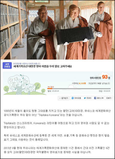 이에 지난 14일 저녁부터 다음 아고라 이슈토론방을 통해 이슈청원을 주도하고 있는 닉네임 이지닥터는 우리말 고유명사인 ‘고려대장경(Goryeo Daejanggyeong)’ 또는 ‘팔만대장경(Palman Daejanggyeong)’으로 바꿔야 한다고 주장했다.