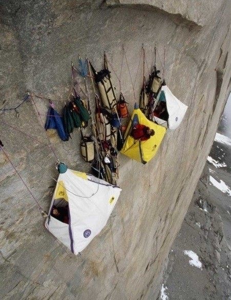 공개된 사진 속에는 아찔한 수직 암벽에 매달려 있는 3개의 텐트 모습이 보인다. 이들은 등반 전문가들이 벼랑 끝에 설치해 휴식을 취하는 1인용 텐트로 알려졌다.