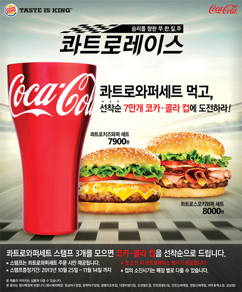 이번 프로모션은 콰트로치즈와퍼 세트와 콰트로스모키와퍼 세트구매 시 스탬프를 제공, 총 3개의 스탬프를 수집한 고객들에게 7만 개 한정 알루미늄 소재의 ‘프리미엄 코카-콜라 컵’을 증정할 예정이다. 활용도가 높고 7만 개 한정의 소장가치를 높인 알루미늄 콜라 컵 제공으로 고객들의 뜨거운 반응이 기대되며 제품 소진 시에는 프로모션이 조기 종료될 수 있다.