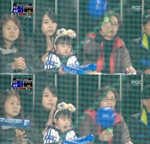 조명진 씨는 딸 수영 양을 무릎에 앉혀 놓고 선수를 응원하고 있다. 특히 또렷한 이목구비와 긴머리를 하고 있어 청순한 미모가 주목됐다.