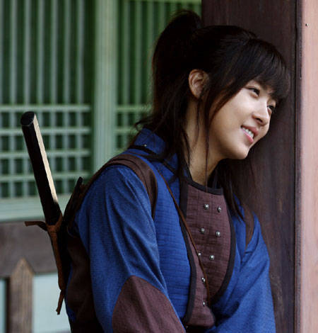 사진 속 하지원은 촬영 중 쉬는 시간을 이용해 환한 미소를 지으며 어딘가를 응시하고 있다. 하지원은 극중 역할을 위해 사내 분장을 했음에도 불구하고 빛나는 미모를 뽐내고 있다.