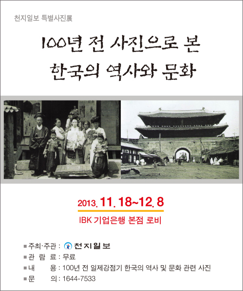 천지일보가 주최하는 이번 사진전은 ‘100년 전 사진으로 본 한국의 역사와 문화’라는 주제로 오는 11월 18일부터 12월 8일까지 약 3주간 IBK기업은행 본점 로비에서 진행된다.