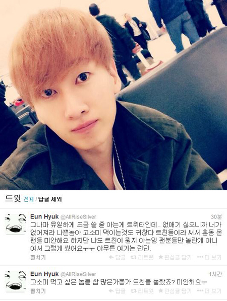 이에 은혁은 자신의 트위터를 통해 “그나마 유일하게 조금 쓸 줄 아는 게 트위터인데.. 없애기 싫으니까 너(해커)가 없어져라 나쁜 놈아 고소미 먹이는 것(고소 하는 것)도 귀찮다”고 말했다.