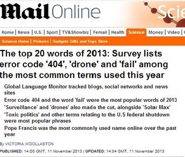 11일(현지시각) 영국 데일리메일은 글로벌 랭귀지 모니터의 연구결과를 인용, “올해 전 세계에서 가장 많이 등장한 ‘올해의 영단어’는 인터넷 오류 메시지인 404”라고 전했다.