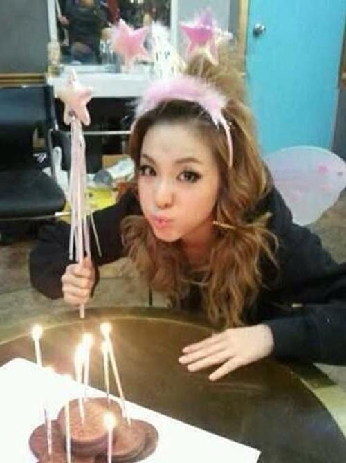 공개된 사진 속 산다라박은 핑크색 요술봉을 들고 별 장식의 머리띠를 한 채 케익의 촛불을 끌 준비를 하고 있다.
