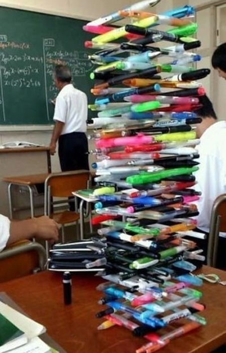 공개된 집중력 최고의 학생들 사진은 수업시간에 한 학생의 책상 위에 필기구로 쌓은 탑의 모습이 담겨있다.