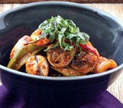 5. 식용유를 두른 팬에 썰어 준비한 고추와 대파, 양파를 넣고 중간 불 이상에서 양념장을 넣고 재빨리 볶는다.