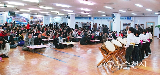 ▲ 신천지예수교 증거장막성전 서울야고보지파 본부 서울교회가 16일 오후 2시 대성전에서 제1기 ‘신천지 1000인의 평가단’ 프로그램을 진행했다. 평가단이 신천지 어린이들의 북 공연에 몰입해 있다. ⓒ천지일보(뉴스천지)