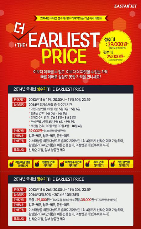 [천지일보=최유라 기자] 이스타항공은 19일 오후 8시부터 오는 30일까지 2014년 국내선 특가 항공권 예약을 진행한다.
