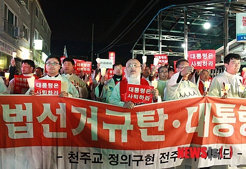 천주교 정의구현사제단 전주교구가 시국미사를 연 건 지난 22일. 전북 군산시 수송동성당에서 개최된 ‘불법 선거 규탄과 대통령 사퇴를 촉구하는 시국미사’에서의 요구사항은 국가기관 대선개입과 관련한 박근혜 대통령의 대국민사과, 책임자 처벌, 사퇴 표명 등이었다. 전주교구는 앞으로도 시국미사를 이어나간다는 방침이다.