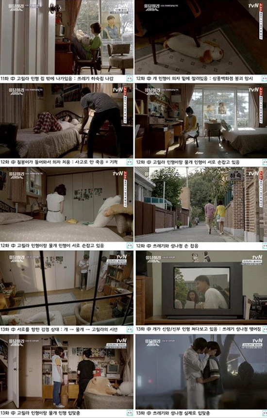 글쓴이에 따르면 드라마에는 개, 물개, 고릴라 인형이 화면에 잡히는데 이는 주인공 칠봉이와 성나정, 쓰레기의 관계와 상황을 암시한다는 것이다.