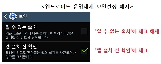 금감원은 또 문자메시지에 포함된 출처가 불분명한 인터넷주소는 클릭하지 말아야 하며, 스마트폰 보안설정 항목에서 ‘알 수 없는 앱 설치의 비허용’ 및 ‘앱 설치 전 확인’을 체크하는 등 보안에 유의해야 한다고 전했다.