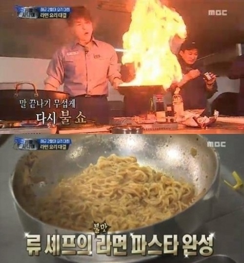 하지만 류수영은 마늘 기름과 간장을 섞어 만든 소스에 불쇼까지 선보이며 차원이 다른 화려한 요리 실력으로 시청자들의 시선을 사로잡았다. 거듭된 불쇼를 선보인 다음 라면을 넣은 후 면을 휘저어 ‘라면 파스타’를 완성했다.