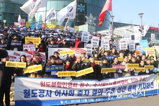 [천지일보=이혜림 기자] 철도노조 파업 2일째인 10일 전국철도노동조합이 서울역 광장에서 ‘철도공사 이사회 출자결의 무효선언 기자회견’을 열었다.