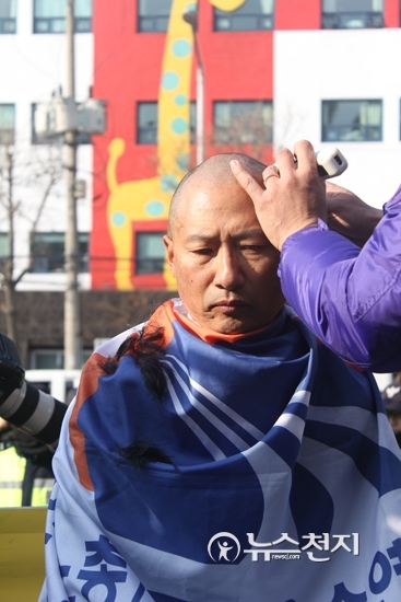 ▲ 김명환 전국철도노동조합 위원장이 10일 오전 서울 용산구 서계동 코레일 서울사옥 앞에서 진행된 ‘수서발 KTX 신설법인 설립 의결 반대 집회’에서 삭발을 하고 있다. ⓒ천지일보(뉴스천지) [천지일보=이혜림 기자] 김명환 전국철도노동조합 위원장이 10일 오전 서울 용산구 서계동 코레일 서울사옥 앞에서 진행된 ‘수서발 KTX 신설법인 설립 의결 반대 집회’에서 “임시 이사회를 열고 수서발 KTX 법인 설립을 의결했다”는 소식을 듣고 삭발을 했다.