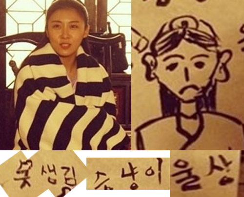 공개된 사진에는 MBC 드라마 ‘기황후’ 촬영장에서 하지원이 자신의 극 중 모습을 그린 그림 옆에 앉아 있다. 그림에는 시무룩한 표정의 하지원의 모습을 그린 뒤 ‘못생김 승냥이 울상’이라는 설명이 적혀있다.