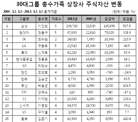 조사 결과 이건희 삼성전자 회장 가족의 주식자산 증가액이 가장 컸다. 이건희 회장 가족(3명)이 보유한 상장사 주식지분 가치는 2008년 2조 2830억 원에서 올해 13조 8710억 원으로 11조 5890억 원 증가해 5년 동안 주식자산이 6배 넘게 늘었다.