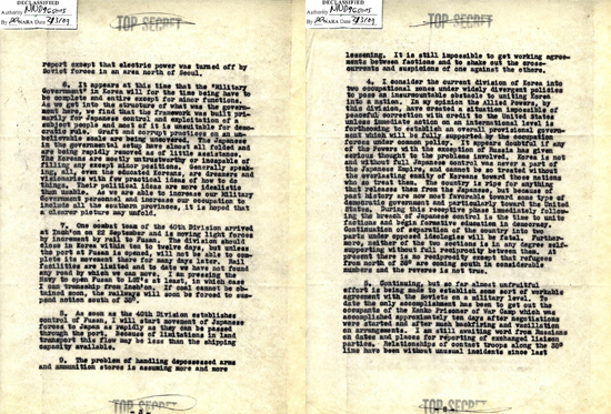 존 하지 장군이 미국 점령군인 24군단을 이끌고 1945년 9월 8일 인천에 상륙해 서울에 진주한지 16일째 되던 날인 9월 24일에 미국 태평양군 사령관에게 보낸 보고서로, 1급 비밀문서이다.