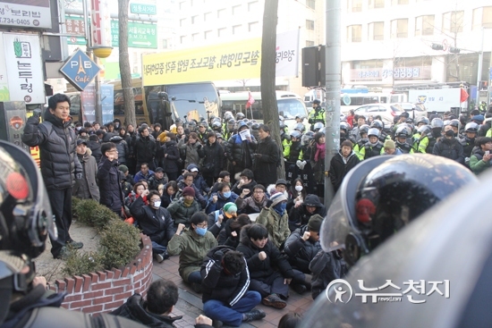- 노조, 물 뿌리고 ‘투쟁’… 경찰, 유리문 깨고 ‘진격’