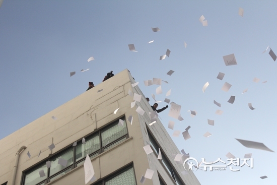 사진은 민주노총 옆 건물 옥상에서 민주노총 관계자들이 호소문을 뿌리고 있는 모습.