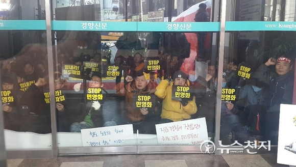 경찰은 이날 아침 건물 입구에 있는 노조원들에게 체포영장을 보여준 뒤 “영장을 집행하기 위해 왔다”고 말하면서 협조해줄 것을 요구했다. 그러나 노조원들은 ‘민영화 저지’ 등의 팻말을 들고 건물 입구를 막았다.