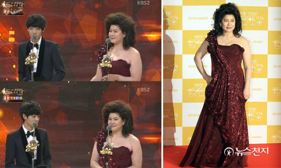 21일 진행된 2013 KBS 연예대상 시상식에 참석한 이영자는 가수 정준영과 함께 작가상 부문을 시상하기 위해 무대에 등장했다. 이날 눈길을 끄는 것은 이영자의 파격 드레스. 이영자는 사자머리에 어깨가 드러나는 붉은 드레스를 입고 등장해 눈길을 끌었다.