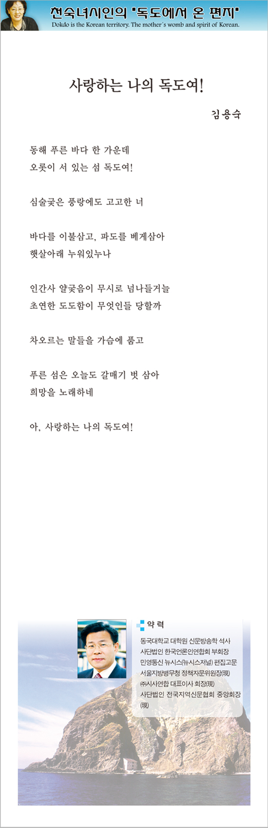관련기사 [독도시] 독도 - 김명숙 [독도시] 독도야 2 - 황용섭 [독도시] 東海의 讚歌 - 지형덕 [독도시] 독도는 靈地다 - 조성제 [독도시] 나는 조선의 딸, 내 어머닌 한반도다 - 김영주 [독도시] 독도, 당신은 우리의 사랑 - 김창수 [독도시] 독도, 당신이여! - 남궁원 [독도시] 독도는 나의 짝사랑 - 박수정 [독도시] 독도는 말한다 - 김 블라시오(성준) [독도시] 달려라 청마야 - 김문길