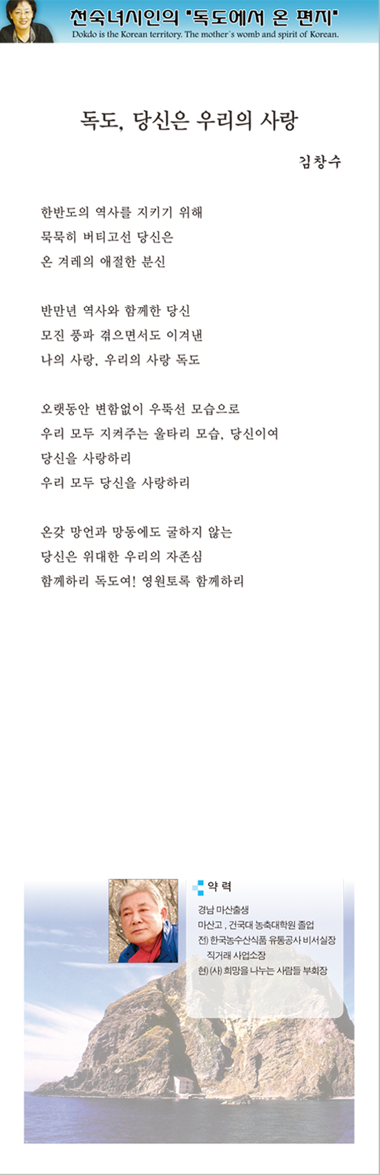 관련기사 [독도시] 사랑하는 나의 독도여! - 김용숙 [독도시] 독도 - 김명숙 [독도시] 독도야 2 - 황용섭 [독도시] 東海의 讚歌 - 지형덕 [독도시] 독도는 靈地다 - 조성제 [독도시] 독도, 당신이여! - 남궁원 [독도시] 독도는 나의 짝사랑 - 박수정 [독도시] 독도는 말한다 - 김 블라시오(성준) [독도시] 달려라 청마야 - 김문길 [독도시] 독도야, 이리 오너라 - 배삼준 [독도시] 독도 일가(獨島 一 家) - 안병천