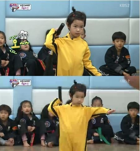 이날 타블로 부녀는 이소룡을 연상케 하는 노란색 트레이닝복을 입고 합기도장을 찾았다. 하루는 낯선 분위기 속에서도 동작을 차근차근 따라 하면서 야무지게 쌍절곤을 휘두르는 모습으로 눈길을 끌었다.