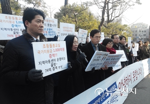 [천지일보=김예슬 기자] 사단법인 전국지역아동센터협의회 회원들이 6일 서울 신문로2가 서울시교육청 앞에서 기자회견을 열고 ‘부처통합 방과 후 돌봄 서비스’ 정책에 대한 재검토 및 보완의 필요성을 주장하고 있다.