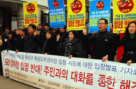 이어 주민대책위는 기자회견문을 낭독했다. 이를 통해 ▲용산구 화상도박경마장 확장 이전 반대 ▲장외발매소(화상도박경마장)의 입점을 강행 시 필사적으로 저항하고 막을 것 ▲용산구청장, 용산구의회, 진영 국회의원은 화상도박경마장 입점하려는 마사회의 태도에 강력히 대처할 것 등을 요구했다.