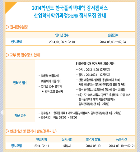 [천지일보=강은영 기자] 서울소재 최고의 공공 기술교육대학인 한국폴리텍대학 서울강서캠퍼스(학장 이인배)는 6일부터 내달 4일까지 2014학년도 정시 신입생을 모집한다고 밝혔다.