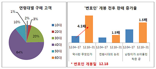 인터파크도서는 영화 ‘변호인’에 등장한 E.H.Carr의 저서 ‘역사란 무엇인가’의 영화 개봉 전후 각 2주간 판매를 분석한 결과 개봉 이후 이전보다 4.1배 판매량이 늘었다고 밝혔다.