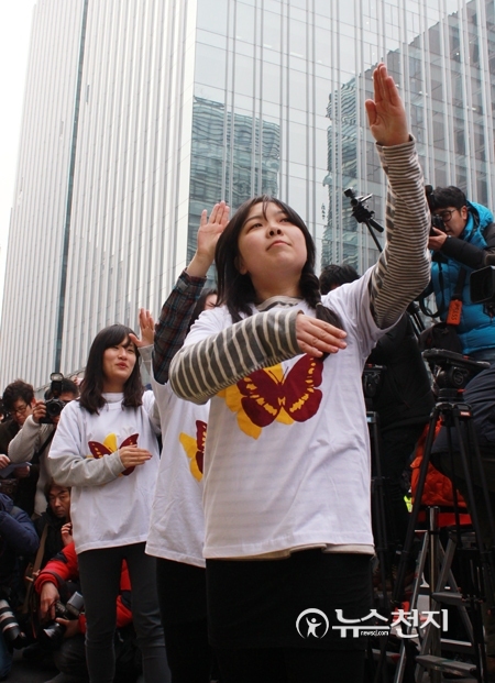 [천지일보=김성희 기자] 8일 정오 서울 종로구 주한일본대사관 앞 평화로에서 (사)한국정신대문제대책협의회(정대협)가 일본군 위안부 문제해결을 위한 ‘제1108차 정기 수요시위’를 개최했다.