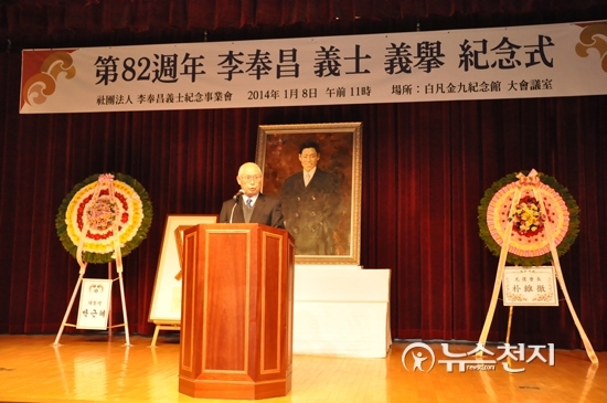 [천지일보=이태교 기자] 문국진 이봉창의사기념사업회장이 8일 오전 서울 용산구 백범김구기념관에서 거행된 ‘이봉창 의사 의거 82주년 기념식’에서 기념사를 전했다.