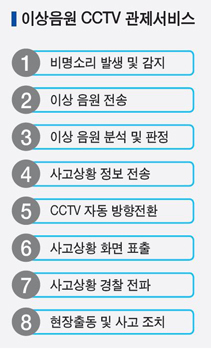 이번에 개발된 ‘이상음원 발생지역 집중관제 서비스’는 비명이나 자동차 충돌 소리, 유리창 깨지는 소리 등이 나면 소리감지장치가 이상 음원 여부를 자동으로 감지한 후 해당 지역의 CCTV가 소리 나는 곳을 비춰 신속하게 현장 대응을 할 수 있게 하는 기술이다.