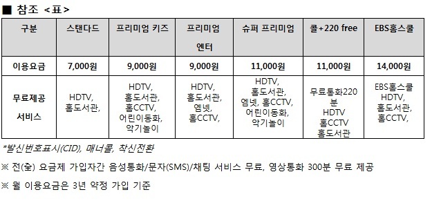 다양한 서비스를 별도 요금 부담 없이 이용할 수 있게 월 1만 1000원에 모든 부가서비스(홈CCTV, 홈도서관, 악기놀이, 어린이동화, 엠넷, HDTV, 폰toTV, 내비게이션)를 무료로 제공하는 슈퍼 프리미엄 요금제도 마련했다.