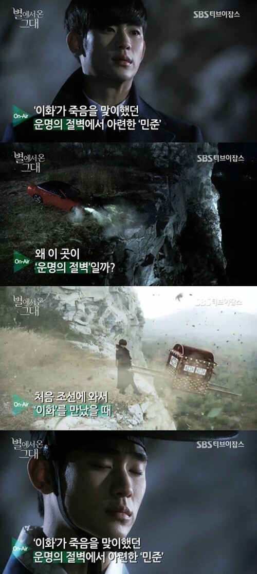 이 절벽은 도민준이 지구로 와서 천송이의 전생인 이화(김현수 분)의 목숨을 구하면서 첫 만남을 가진 장소이다. 이와 동시에 이화가 도민준의 품에서 죽음을 맞게 되는 곳이기도 해 보는 이들을 궁금하게 만들었다.