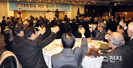 [천지일보=이태교 기자] 국가원로회의(상임의장 이상훈)가 17일 서울 세종문화회관 세종홀에서 대국민 시국선언에 나선 가운데 이상훈 상임의장이 건배사를 전하고 있다.