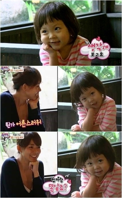 이날 방송에서 추사랑은 엄마 야노시호의 버릇인 턱 괴기를 똑같이 따라해 보는 사람들을 미소 짓게 했다.