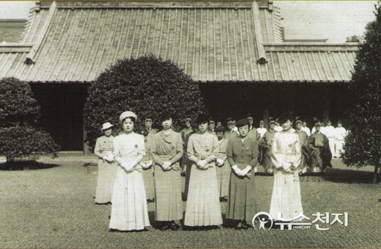 [천지일보=김현진 기자] 일본은 태평양전쟁을 앞두고 조선 왕족들을 이곳 신사에 참배시켰다. 우측 2번째 이방자 여사가 도열하고 있다.