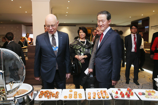 [천지일보=유영선 기자] 허창수 전경련 회장(오른쪽)이 21일(현지시각) 스위스 벨베데레 호텔에서 열린 ‘2014 한국의 밤(Korea Night)’행사에 참석, 클라우주 WEF 총재와 한식을 맛보고 있다.